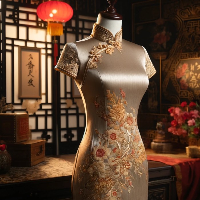 Voici une image représentant une robe traditionnelle chinoise en soie, un cheongsam (ou qipao), mettant en valeur son élégance et ses broderies raffinées.